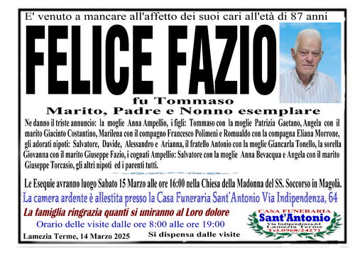 Ne danno il triste annuncio la moglie Anna Ampellio, i figli: Tommaso con la moglie Patrizia Gaetano, Angela con il marito Giacinto Costantino, Marilena con il compagno Francesco Polimeni e Romualdo con la compagna Eliana Morrone, gli adorati nipoti: Salvatore, Davide, Alessandro e Arianna, il fratello Antonio con la moglie Giancarla Tonello, la sorella Giovanna con il marito Giuseppe Fazio, i cognati Ampellio: Salvatore con la moglie Anna Bevacqua e Angela con il marito Giuseppe Torcasio, gli altri nipoti ed i parenti tutti.