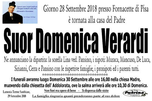 Ne annunciano la dipartita: la sorella Lina ved. Pansino, i nipoti: Muraca, Mancuso, De Luca,