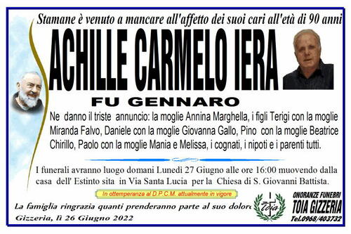 I funerali avranno luogo domani Lunedì 27 Giugno alle ore 16:00 muovendo dalla