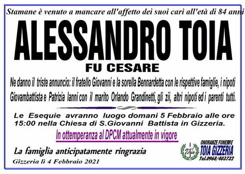 Le Esequie avranno luogo domani 5 Febbraio alle ore