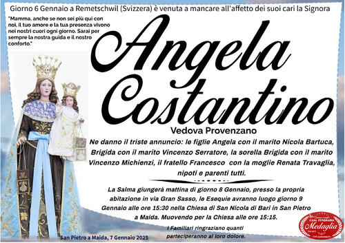 Giorno 6 Gennaio a Remetschwil (Svizzera) è venuta a mancare all'affetto dei suoi cari la Signora ANGELA COSTANTINO ved. Provenzano