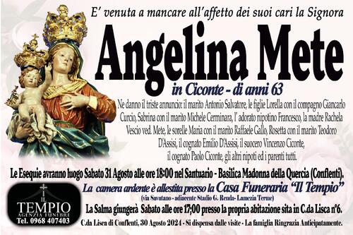 Le Esequie avranno luogo Sabato 31 Agosto alle ore 18:00 nel Santuario - Basilica Madonna della Quercia (Conflenti).