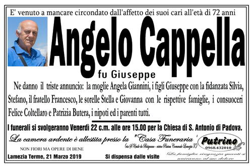 I funerali si svolgeranno Venerdì 22 c.m. alle ore 15.00 per la Chiesa di S. Antonio di Padova.