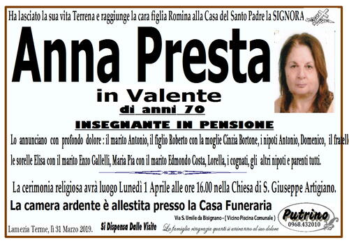 Lo annunciano con profondo dolore : il marito Antonio, il figlio Roberto con la moglie Cinzia Bortone, i nipoti Antonio, Domenico, il fratello Vincenzo,