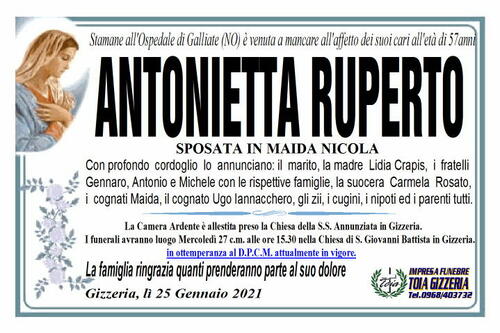 I funerali avranno luogo Mercoledì 27 c.m. alle ore 15.30 nella Chiesa di S. Giovanni Battista in Gizzeria.