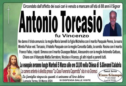 Ne danno il triste annuncio: la moglie Mara Iannelli, la figlia Michelina con il marito Pasquale Penna, la nuora Mirella Pulice ved. Torcasio, il fratello Pasquale con la moglie Concetta Gatto, la sorella Rosina con il marito Franco Falbo, i nipoti: Simona con il marito Giuseppe Matani, Alessandro con la moglie Antonella Gattuso, Chiara con il fidanzato Mattia Serratore, Nicolas e Vincenzo, gli altri nipoti e parenti tutti.