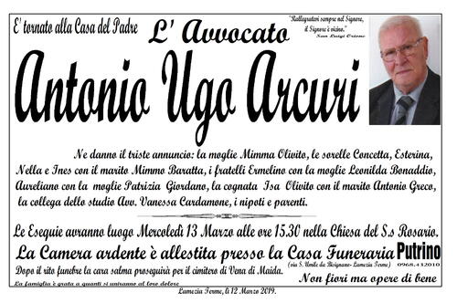 Le Esequie avranno luogo Mercoledì 13 Marzo alle ore 15.30 nella Chiesa del S.s Rosario.