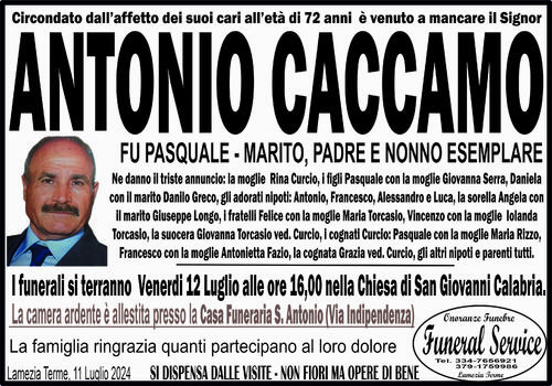 Ne danno il triste annuncio: la moglie Rina Curcio, i figli Pasquale con la moglie Giovanna Serra, Daniela