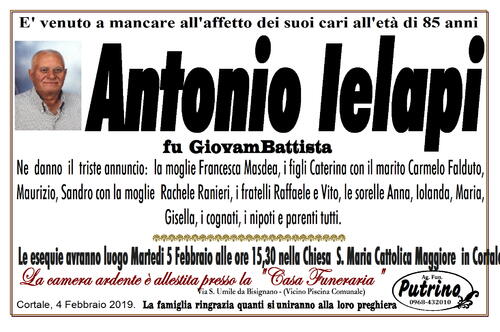 Le esequie avranno luogo Martedi 5 Febbraio alle ore 15,30 nella Chiesa S. Maria Cattolica Maggiore in Cortale.