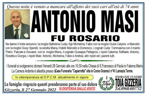 I funerali si svolgeranno domani Venerdi 28 Gennaio alle ore 10:30 nella Chiesa di S.Francesco di Paola in Falerna Marina.