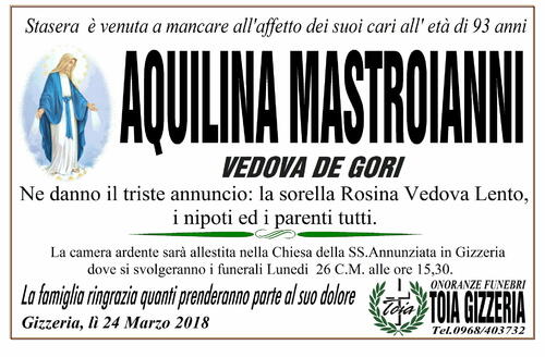Stasera è venuta a mancare all'affetto dei suoi cari all' età di 93 anni