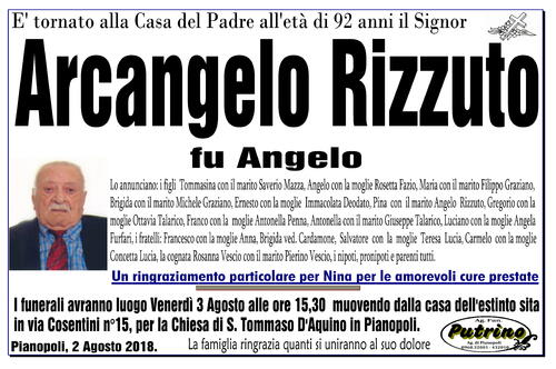 I funerali avranno luogo Venerdì 3 Agosto alle ore 15,30 muovendo dalla casa dell'estinto sita