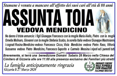 Sussanna vedova Pietro Mendicino, Francesco Saporito e Carmelo Messina i nipoti ed i parenti tutti.