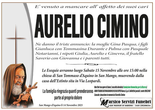 Le Esequie avranno luogo Sabato 15 Novembre alle ore 15:00 nella chiesa di San Tommaso d'Aquino in San Mango, muovendo dalla casa dell'Estinto sita in Via Leopardi.