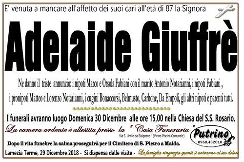 I funerali avranno luogo Domenica 30 Dicembre alle ore 15,00 nella Chiesa del S.S. Rosario.