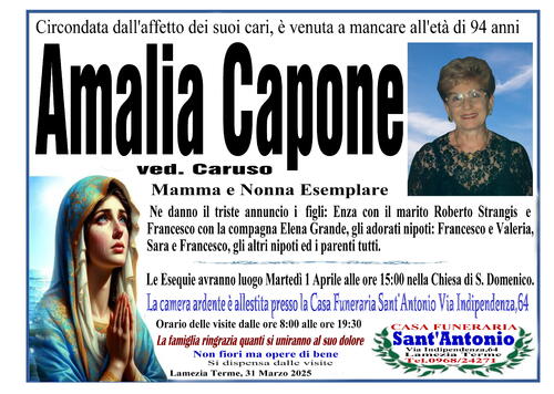 Ne danno il triste annuncio i figli: Enza con il marito Roberto Strangis e Francesco con la compagna Elena Grande, gli adorati nipoti: Francesco e Valeria, Sara e Francesco, gli altri nipoti ed i parenti tutti.