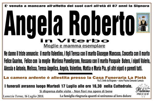 Alessia e Antonio, Melissa, Teresa Angelica, Angela, Valentino, Mattia e Maria Pia, gli altri nipoti e parenti tutti.