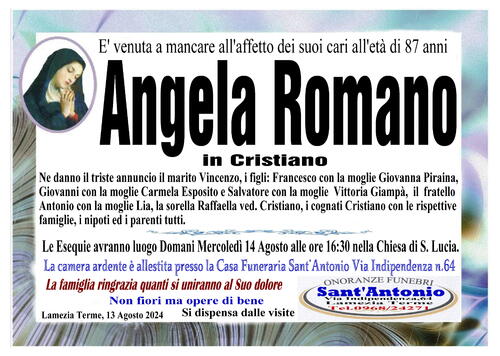 Ne danno il triste annuncio il marito Vincenzo, i figli: Francesco con la moglie Giovanna Piraina, Giovanni con la moglie Carmela Esposito e Salvatore con la moglie Vittoria Giampà, il fratello Antonio con la moglie Lia, la sorella Raffaella ved. Cristiano, i cognati Cristiano con le rispettive famiglie, i nipoti ed i parenti tutti.