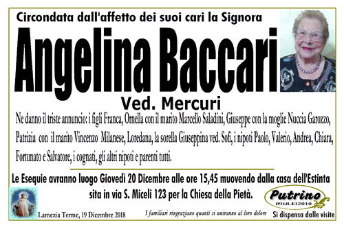 Le Esequie avranno luogo Giovedì 20 Dicembre alle ore 15,45 muovendo dalla casa dell'Estinta