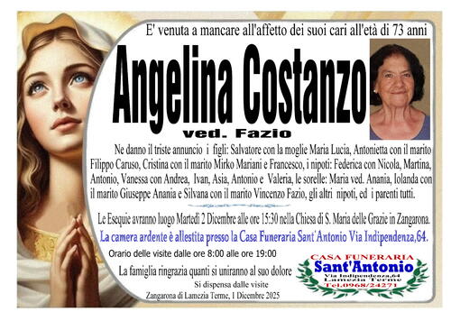 Ne danno il triste annuncio i figli: Salvatore con la moglie Maria Lucia, Antonietta con il marito Filippo Caruso, Cristina con il marito Mirko Mariani e Francesco, i nipoti: Federica con Nicola, Martina, Antonio, Vanessa con Andrea, Ivan, Asia, Antonio e Valeria, le sorelle: Maria ved. Anania, Iolanda con il marito Giuseppe Anania e Silvana con il marito Vincenzo Fazio, gli altri nipoti, ed i parenti tutti.