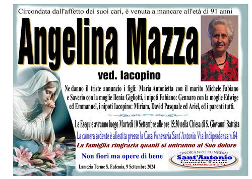 Ne danno il triste annuncio i figli: Maria Antonietta con il marito Michele Fabiano e Saverio con la moglie Ilenia Gigliotti, i nipoti Fabiano: Gennaro con la moglie Edwige ed Emmanuel, i nipoti Iacopino: Miriam, David Pasquale ed Ariel, ed i parenti tutti.