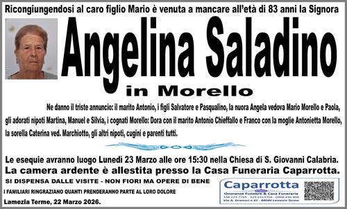Ne danno il triste annuncio: il marito Antonio, i figli Salvatore e Pasqualino, la nuora Angela vedova Mario Morello e Paola, gli adorati nipoti Martina, Manuel e Silvia, i cognati Morello: Dora con il marito Antonio Chieffallo e Franco con la moglie Antonietta Morello, la sorella Caterina ved. Marchiotto, gli altri nipoti, cugini e parenti tutti.