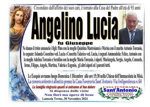 Ne danno il triste annuncio i figli: Pino con la moglie Quintina Mastroianni e Marisa con il marito Antonio Torcasio, le cognate: Iolanda Cosentino ved. Lucia e Concetta Talarico ved. Lucia, i cognati Ammendola: Felice, Antonio con la moglie Adelina Torcasio e Serafino con la moglie Maria Torcasio, i nipoti: Mariangela, Sergio, Angelo, Consuelo, Irene, Filippo, Angelo, Martina, Valeria ed Eugenio, gli altri nipoti ed i parenti tutti.