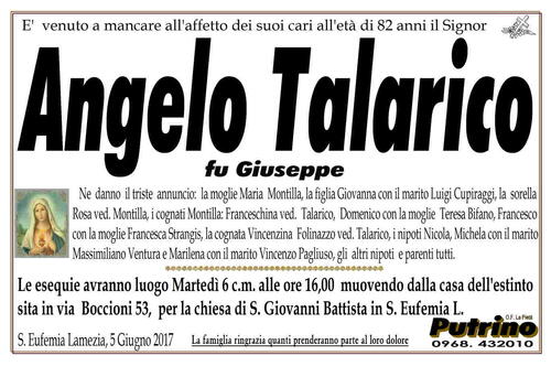 Le esequie avranno luogo Martedì 6 c.m. alle ore 16,00 muovendo dalla casa dell'estinto