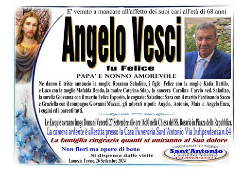 Ne danno il triste annuncio la moglie Rosanna Saladino, i figli: Felice con la moglie Katia Dattilo e Luca con la moglie Mafalda Renda, la madre Caterina Sdao, la suocera Carolina Curcio ved. Saladino, la sorella Giovanna con il marito Felice Esposito, le cognate Saladino: Sara con il marito Ferdinando Sacco e Graziella con il compagno Giovanni Mazzei, gli adorati nipoti: Angelo, Antonio, Maia e Angelo Enea, i cugini ed i parenti tutti.