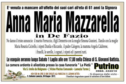 Le esequie avranno luogo Sabato 1 Luglio alle ore 17,00 nella Chiesa di S. Giovanni Battista.