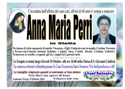 Ne danno il triste annuncio il marito Vincenzo, i figli: Umberto con la moglie Cristina Torcasio e Teresa con il Antonio Salatino, i nipoti: Sara, Cristel, Alessio, Cristian, Gabriel e Francesco, le sorelle, i cognati, gli zii, i cugini ed i parenti tutti.