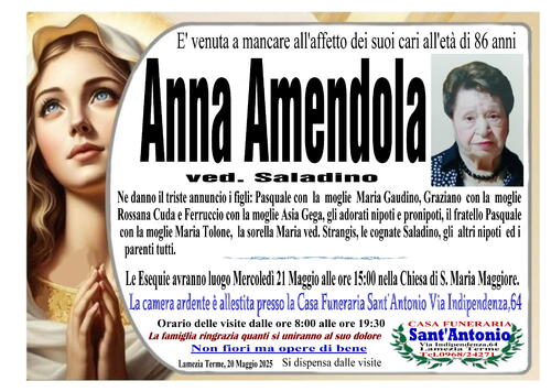 Ne danno il triste annuncio i figli: Pasquale con la moglie Maria Gaudino, Graziano con la moglie Rossana Cuda e Ferruccio con la moglie Asia Gega, gli adorati nipoti e pronipoti, il fratello Pasquale con la moglie Maria Tolone, la sorella Maria ved. Strangis, le cognate Saladino, gli altri nipoti e parenti tutti.