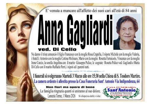 Ne danno il triste annuncio il figlio Francesco con la moglie Rosa Crapella, il nipote Michele con moglie Valeria, i fratelli: Antonio con la moglie Cettina Molinaro, Mario con la moglie Rosetta Ferraiuolo, Vincenzo con la moglie Irene Curcio, la sorella Angelina con il marito Giuseppe Pulice, le cognate: Rosetta Pulice ved. Gagliardi e Maria Di Cello con il marito Raffaele Perri, i nipoti ed i parenti tutti.