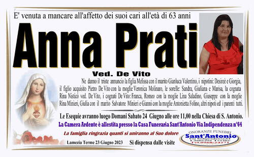 Ne danno il triste annuncio, la figlia Melissa con il marito Gianluca Valentino, i nipotini: Desireè e Giorgia, il figlio acquisito Pietro De Vito con la moglie Veronica Molinaro, le sorelle: Sandra, Giuliana e Marisa, la cognata Rina Nisticò ved. De Vito, i cognati De Vito: Franca, Romeo con la moglie Lina Saladino, Giuseppe con la moglie Rina Minieri, Giulia con il marito Salvatore Minieri e Gianni con la moglie Antonietta Folino, altri nipoti ed i parenti tutti.