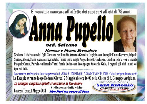 Ne danno il triste annuncio i figli: Giovanna con il marito Armando Grande e Guglielmo con la moglie Emma Barracco, i nipoti: Simone, Alessia, Mario e Annamaria, i fratelli: Tonino con la moglie Angela Ferretti, Giulia ved. Condina, Maria con il marito Pasquale Caruso, Patrizia con il marito Vanni Perri e Luciano con la compagna Antonella Gallo, i cognati, gli altri nipoti ed i parenti tutti.