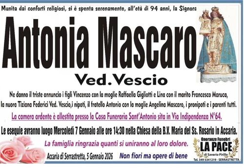 Ne danno il triste annuncio i figli Vincenzo con la moglie Raffaella Gigliotti e Lina con il marito Francesco Maruca, la nuora Tiziana Federici Ved. Vescio, i nipoti, il fratello Antonio con la moglie Angelina Mascaro, i pronipoti e i parenti tutti.