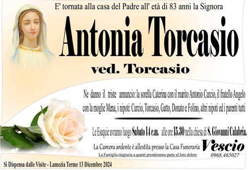 Ne danno il triste annuncio: la sorella Caterina con il marito Antonio Curcio, il fratello Angelo con la moglie Mena, i nipoti Curcio, Torcasio, Gatto, Donato e Folino altri nipoti ed i parenti tutti.