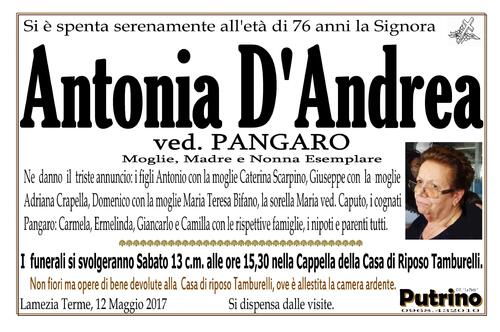 Ne danno il triste annuncio : i figli Antonio con la moglie Caterina Scarpino , Giuseppe con la moglie Adriana Crapella , Domenico con la moglie Maria Teresa Bifano , la sorella Maria ved. Caputo , i cognati Pangaro : Carmela , Ermelinda , Giancarlo e Camilla con le rispettive famiglie , i nipoti e parenti tutti
