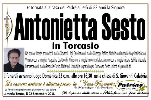 Lamezia Terme, lì 22 Settembre 2018. Si dispensa dalle visite - Non fiori ma opere di bene