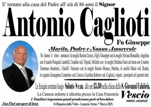Le Esequie avranno luogo Sabato 8 c.m. alle ore 15.30 nella chiesa della S. Giovanni Calabria.