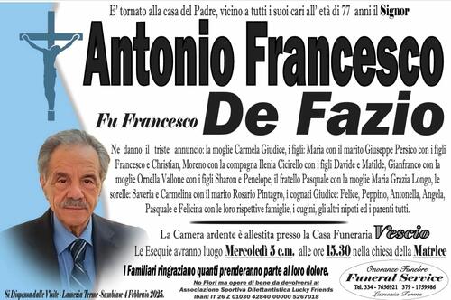 La Camera ardente è allestita presso la Casa Funeraria Vescio