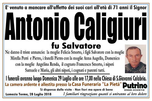 I funerali avranno luogo Domenica 29 Luglio alle ore 17,00 nella Chiesa di S.Giovanni Calabria.