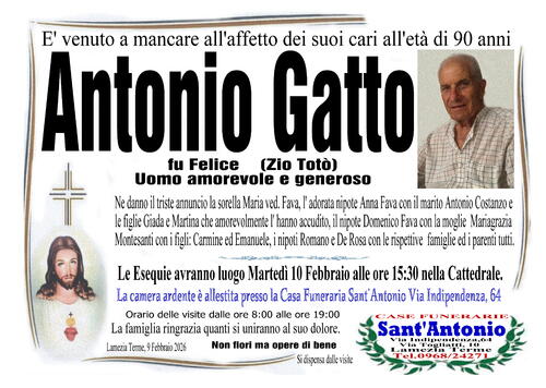 Ne danno il triste annuncio la sorella Maria ved. Fava, l'adorata nipote Anna Fava con il marito Antonio Costanzo e le figlie Giada e Martina che amorevolmente l' hanno accudito, il nipote Domenico Fava con la moglie Mariagrazia Montesanti con i figli Carmine ed Emanuele, i nipoti Romano e De Rosa con le rispettive famiglie ed i parenti tutti.