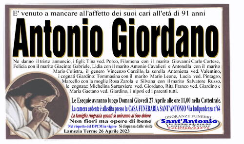 Ne danno il triste annuncio, i figli: Tina ved. Porco, Filomena con il marito Giovanni Carlo Cortese, Felicia con il marito Giacinto Gabriele, Lidia con il marito Antonio Cavalieri e Antonella con il marito Mario Colistra, il genero Vincenzo Garzillo, la sorella Antonietta ved. Valentino, i cognati Giardino: Tommasina con il marito Mario Leone, Lucia ved. Pintagro, Marcello con la moglie Rosa Zarola e Silvana con il marito Salvatore Russo, le cognate: Michelina Sartarsiere ved. Giordano, Rita Franco ved. Giardino e Maria Gaetano ved. Giardino, i nipoti ed i parenti tutti.