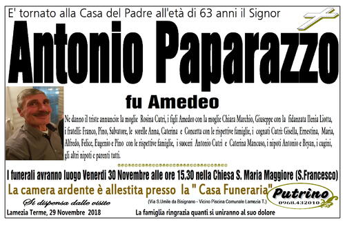 I funerali avranno luogo Venerdi 30 Novembre alle ore 15.30 nella Chiesa S. Maria Maggiore (S.Francesco)