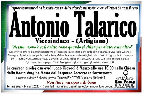 La camera ardente è allestita presso ''Palazzo PINGITORE'' sito in via Umberto I.