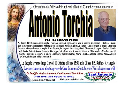 Ne danno il triste annuncio la moglie Francesca Smiles, i figli: Angela con il marito Alessandro Cittadino, Gianni con la moglie Daniela Ienco e Antonello con la moglie Alessia Gigliotti, i fratelli: Giuseppe con la moglie Christina Cometta e Domenico con la moglie Rosa Caruso, la cognata Anna Angioi ved. Marziano, i cognati Smiles: Maria ved. Lucia, Antonietta con il marito Giuseppe Cutrì, Lina con il marito Vincenzo Chiaravalle e Natalina con il marito Giuseppe Molinaro, i nipoti: Gianmarco con la fidanzata Maria Claudia, Andrea, Sophia, Anna, Antonio e Carlo, altri nipoti ed i parenti tutti.