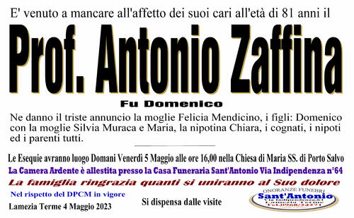 Ne danno il triste annuncio la moglie Felicia Mendicino, i figli: Domenico con la moglie Silvia Muraca e Maria, la nipotina Chiara, i cognati, i nipoti ed i parenti tutti.