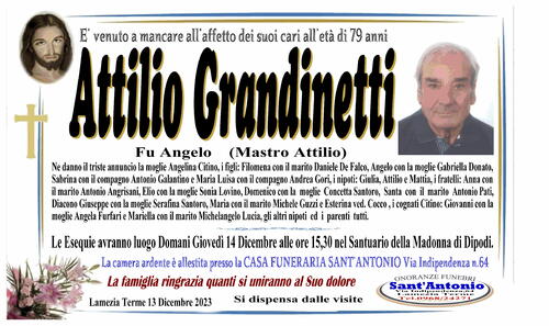 Ne danno il triste annuncio la moglie Angelina Citino, i figli: Filomena con il marito Daniele De Falco, Angelo con la moglie Gabriella Donato, Sabrina con il compagno Antonio Galantino e Maria Luisa con il compagno Andrea Gori, i nipoti: Giulia, Attilio e Mattia, i fratelli: Anna con il marito Antonio Angrisani, Elio con la moglie Sonia Lovino, Domenico con la moglie Concetta Santoro, Santa con il marito Antonio Pati, Diacono Giuseppe con la moglie Serafina Santoro, Maria con il marito Michele Guzzi e Esterina ved. Cocco, i cognati Citino: Giovanni con la moglie Angela Furfari e Mariella con il marito Michelangelo Lucia, gli altri nipoti ed i parenti tutti.