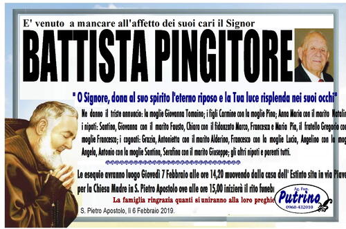 S. Pietro Apostolo, lì 6 Febbraio 2019. OF. PUTRINO 0968-432010
